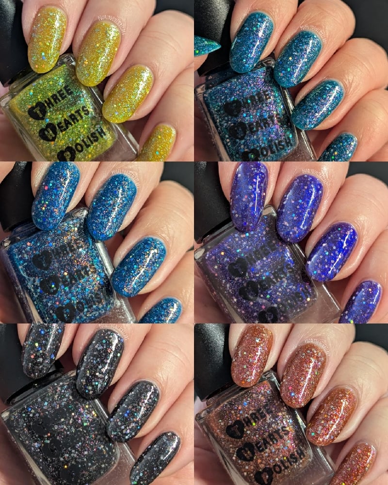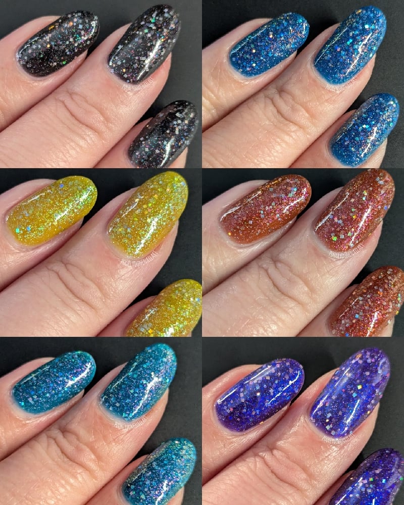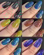 6 jelly polishes filled with square and hex silver holo glitters with a different colour shimmer in all