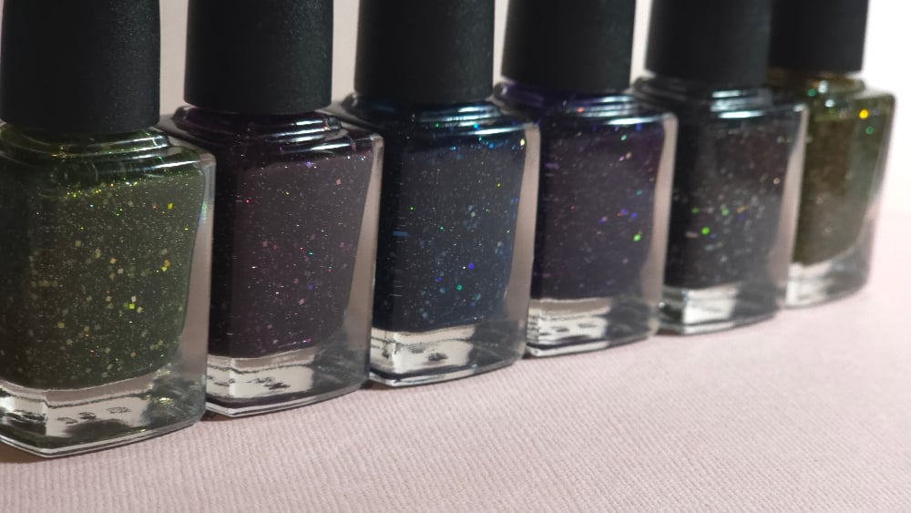 6 squishy jelly polishes filled with square and micro holo silver glitters